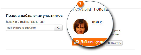 в блоке «Поиск и добавление участников» введите email ранее зарегистрированного пользователя сервиса Expodat и нажмите кнопку «Найти»